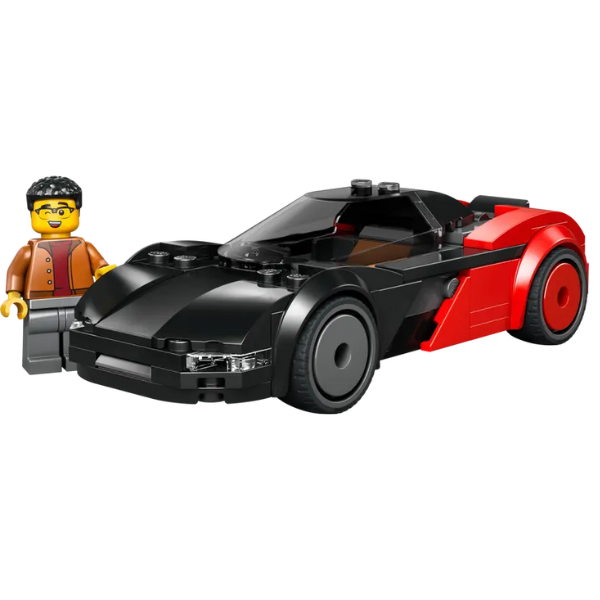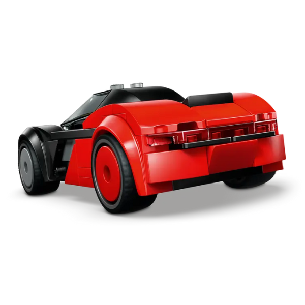 Lift the rear hatch of the small black and red sports car to access the toy battery pack and put the driver minifigure behind the wheel for hours of foot-to-the-floor action