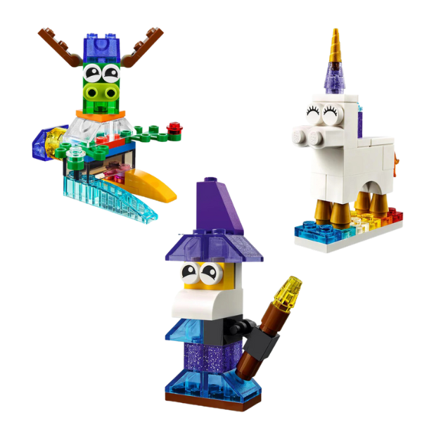 • Boost kids’ creativity with this 500-piece playset featuring a great selection of transparent LEGO pieces, plus classic LEGO bricks, eyes and wheels to create 8 fun models and more.