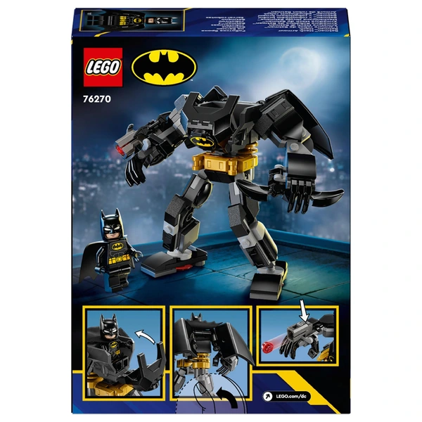 Kids insert the LEGO Batman minifigure into the mech toy’s opening cockpit. The mech figure holds a buildable Batarang and also has a stud launcher on its arm. On its back is a jetpack covered by a 2-part cape, which can be moved into various positions. The minifigure wears a fabric cape and also holds another Batarang. Which can be stored on the right arm of the mech. The mech’s jointed arms, legs and also hands let fans of Batman and super-hero figures enjoy endless hands-on battle action.