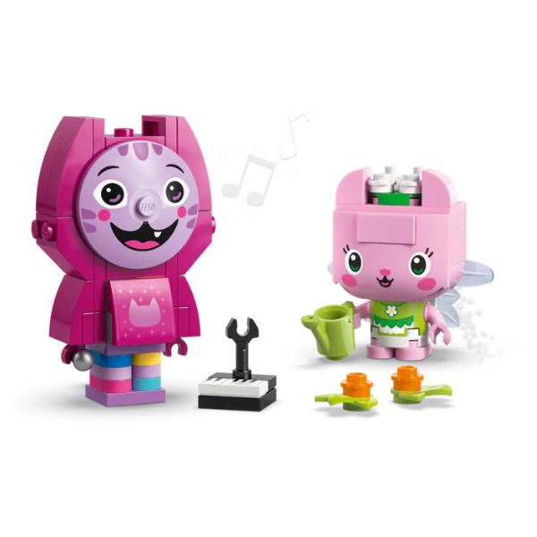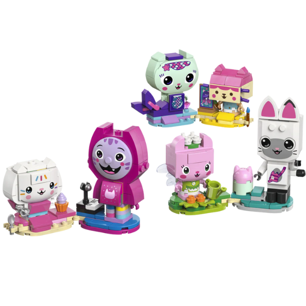 The set includes 6 figures to build, each with accessories from the TV show. MerCat has a diamond, Baby Box has a painting of Gabby, Kitty Fairy has a watering can, Pandy Paws has a dollhouse, Cakey has a cake and Daniel James ‘DJ’ Catnip has a piano. There are 2 detachable figures on each base
