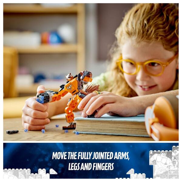 Kids take Rocket the racoon on another thrilling mission. Armed with a supersized 6-stud blaster, the awesome Superhero is ready to take on the action. There’s also a smaller toy blaster for Rocket to use when he’s not inside the mech. For added digital fun, the LEGO Builder app features zoom and also rotate tools that let kids visualise their Marvel Collectable model as they build.