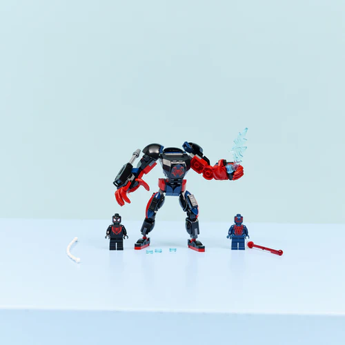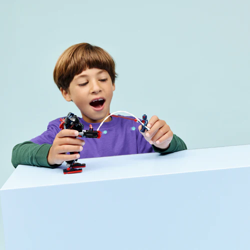 A powerful 3-stud shooter, web rope and razor web power blasts attached to the Miles Morales mech’s arms, bring the building toy and minifigures to life in kids’ imaginations