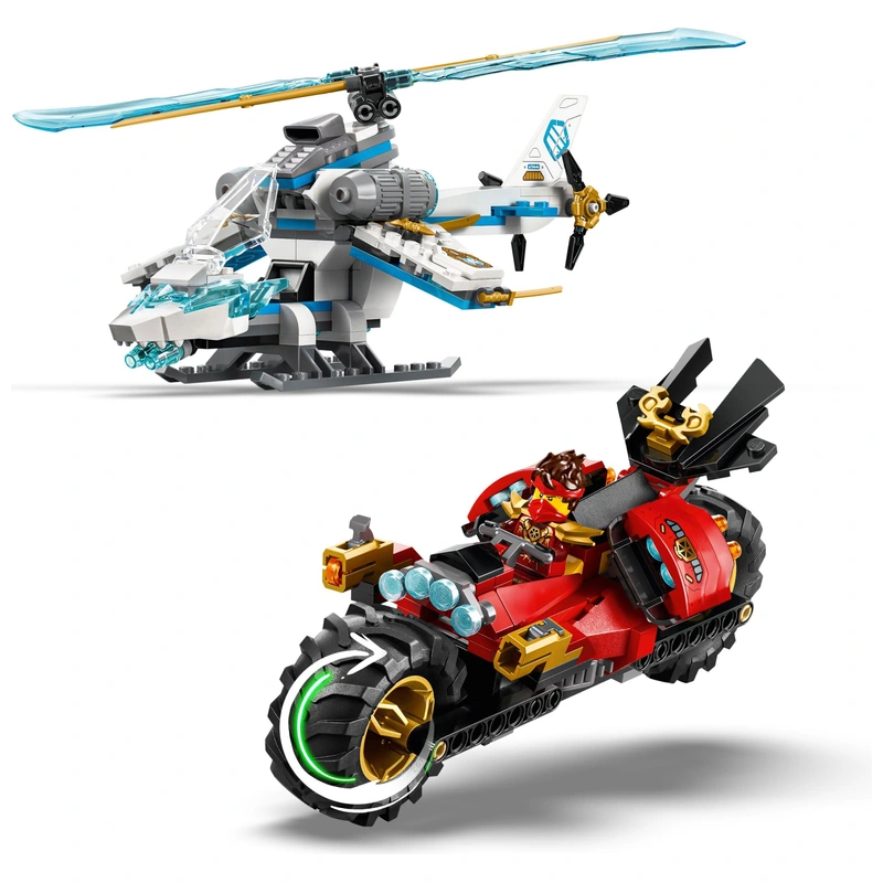 Kids can enjoy unlimited role-play options with a motorcycle toy that has moving wheels, a saddle-cockpit and 2 stud shooters. Or take to the sky with a helicopter toy that has an opening cockpit and rotating blades. The NINJAGO set features 6 minifigures: Kai, Zane, dragon form Jay and Euphrasia to play out battles against the Acid Monster and Loyalist. Kids can build the playset with confidence using the LEGO® Builder app – zoom, rotate in 3D and track progress with easy-to-follow digital instructions. Set contains 642 pieces.