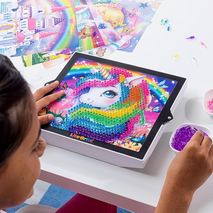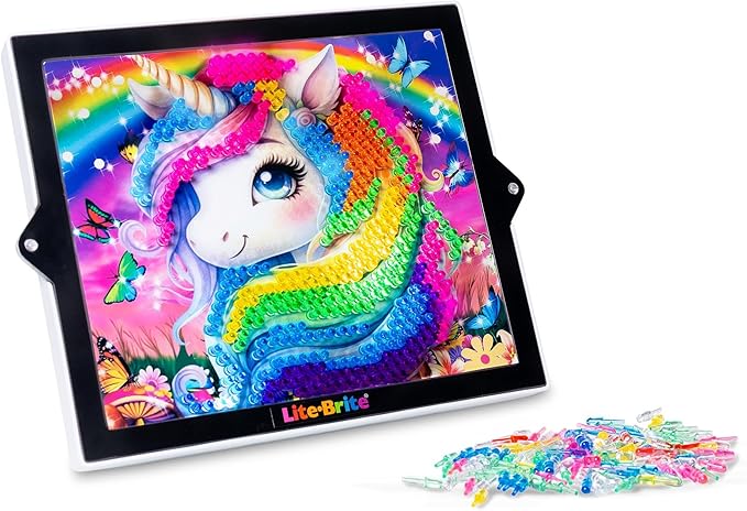 • Featuring six vibrant, edge-to-edge unicorn and rainbow-themed stencils, this Colorpop Lite-Brite takes creativity to a whole new level. The translucent grid with Magic Glow makes each design shine brighter than ever, while 650 mini pegs let kids bring their imaginations to life with precision and detail.
