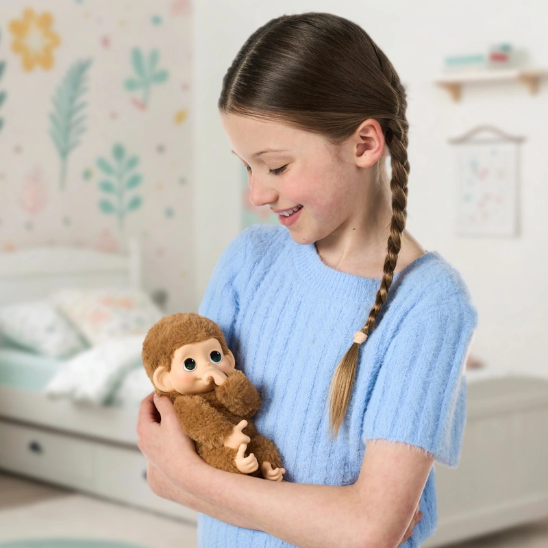 Pepi Peach is the snack-loving sweetheart from Little Live Pets My Baby Monkey Minis! Super cuddly and interactive, Pepi Peach responds to your touch with over 20 cute sounds and realistic reactions. Feed her, pet her or let her suck her thumb using her special mouth button and she’ll giggle and make adorable noises. With her grippy hands and feet, Pepi can cling, hang and hug, just like a real baby monkey!