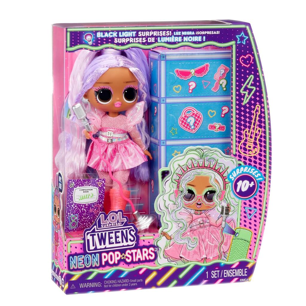 Get ready to set the stage aglow with fashions full of neon surprises. Introducing L.O.L. Surprise! Tweens Neon Pop Stars fashion doll. Kitty K hits every note with her rockin’ style and accessories to unbox. Use Kitty K’s UV light to turn her world neon. Watch as her fashions and accessories glow neon bright, creating an epic stage experience ideal for colourful, imaginative play. The iconic glam pop star, with the most purrfect style inspired by cute kitties and hot beats, and Big Sis to Kitty Queen, is now in Tweens form