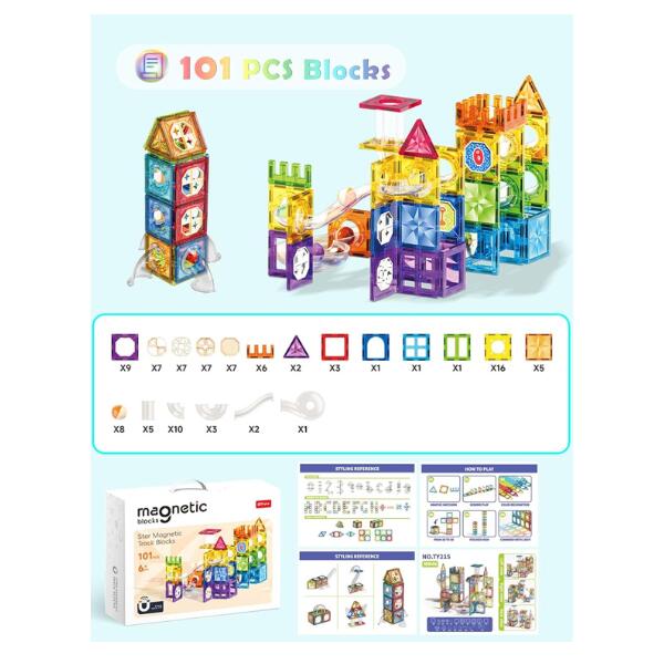 Introducing the Magnetic Tiles 101 Piece Pack . The set contains 10 colorful, durable magnetic tiles. It allows children to easily construct castles, structures, and imaginative designs. It is designed to promote creativity, problem-solving skills, spatial awareness, and fine motor skills.