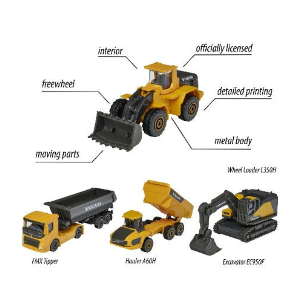 Majorette Volvo Construction 4 Pieces Giftpack– take your toy construction site to the next level. Gift set comes with 4 Volvo construction vehicles – excavator, wheel loader, dump truck, and also a articulated hauler.