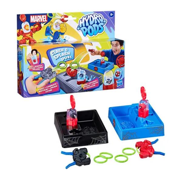 Reveal, collect, and battle with the Hydro Pods Marvel Clash & Splash Duel, a complete battle set with everything needed to launch into hydro-powered play. First, fill the Marvel pod with water, plug in the target, and watch as classic Marvel characters are revealed. This kids toy set comes with Spider-Man and Venom — who will win in a hydro battle? Next, place the Marvel Hydro Pods characters in the slots in the Tide Trapper water trays to prepare for battle. Load a disc into the included launchers and aim at your opponent’s target. A direct hit! As the target flies off, the water drains out of the bottom of the pod and the character sinks in defeat. Tide Trappers keep water contained, so kids can keep battling with this water toy without making a mess. Look for other Hydro Pods sets including battle-ready Aqua Armor and mystery packs to trade with friends or give as gifts for kids ages 6 and up. (Sold separately. Subject to availability.) Copyright MARVEL. All trademarks and registered trademarks are the property of their respective owners. Hydro Pods and HASBRO and all related trademarks and logos are trademarks of Hasbro, Inc. comes great responsibility”.