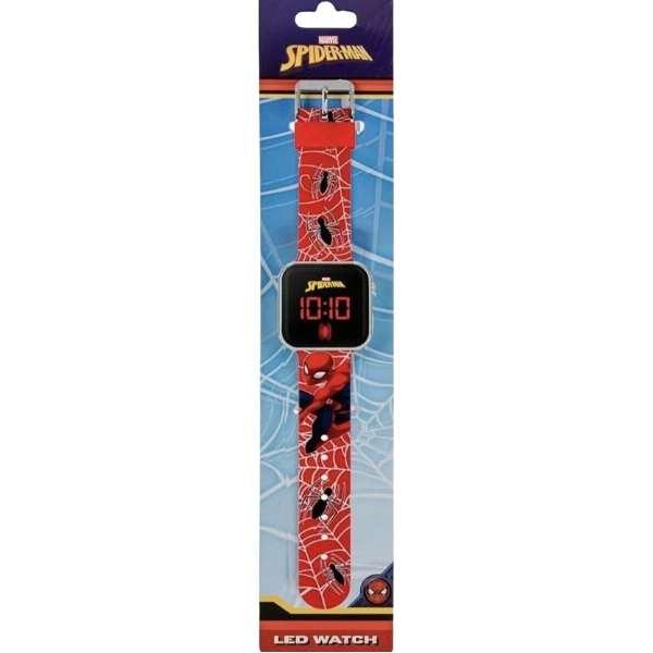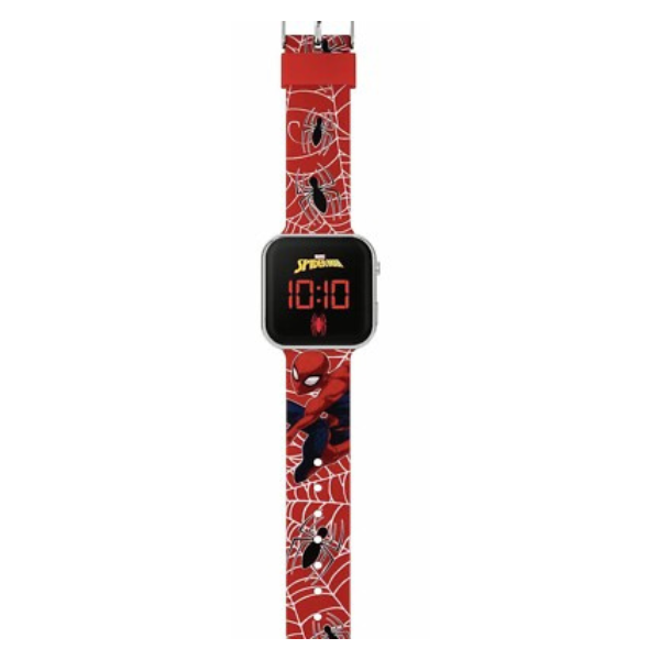 Introducing the Marvel Spiderman LED Silicone Strap Watch. LED children’s watch in stylish Spider-Man design (red) with bright digital display and soft acrylic strap. The LED digital display provides information about hours, minutes, seconds, month and day
