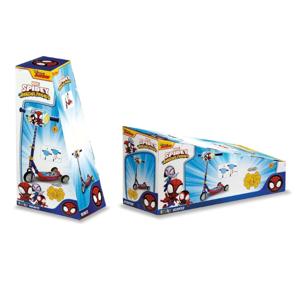 Marvel Spidey Tri Scooter . Spidey scooter with 3 wheels and a cheerful spidey print on the handlebars and footboard. The scooter is 55 x 32 x 70 centimetres and suitable for children aged 3 and over. The handlebars are adjustable in height.