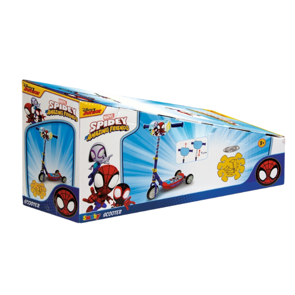 Marvel Spidey Tri Scooter . Spidey scooter with 3 wheels and a cheerful spidey print on the handlebars and footboard. The scooter is 55 x 32 x 70 centimetres and suitable for children aged 3 and over. The handlebars are adjustable in height.