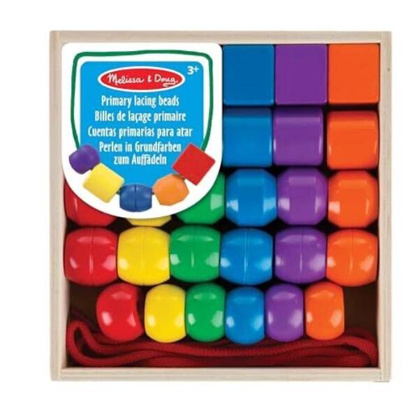 Introducing the Melissa And Doug Wooden Jumbo Beads with 18 plus solid-wood beads. Encourages cognitive development, auditory skills, visual perception, colour and also shape recognition. Hand eye and fine motor development, early math skills, patterning and creative expressions.