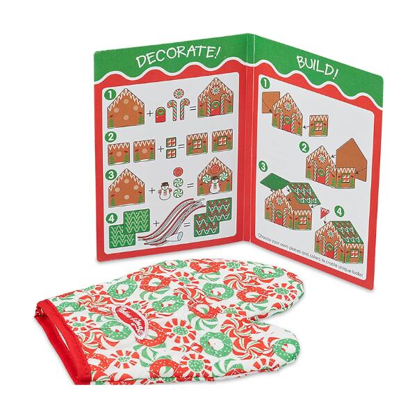 Contains: 6-piece wooden gingerbread house, 7 wooden house accessories. 7 wooden cookies in a package, 15 wooden candies and 24 cords in a package, icing pen, oven mitt, sprinkles bottle, tray, wooden knife and spatula, reusable activity card.