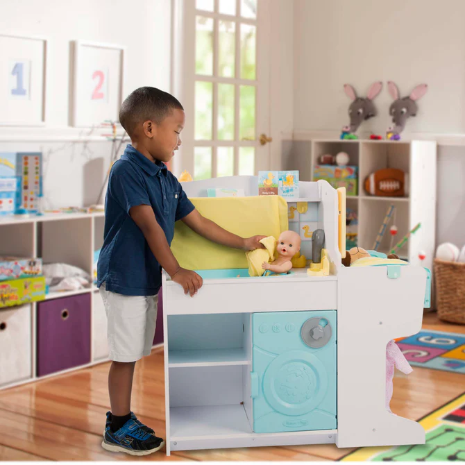 This multi-functional doll and stuffed animal baby care activity center has everything kids need to nurture and play with their special babies! The sturdy wooden center includes a kitchen with refrigerator, sink, and high chair. A changing and bathing area features a bathtub with spray nozzle and flip-down changing mat, a mirror, wipes dispenser, diaper disposal, and washing machine with clicking dial.