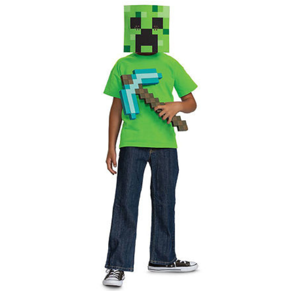 This set includes a stiff felt Creeper mask with elastic strap and a diamond pickaxe measuring 15.75 inches long, perfect for any Minecraft fan