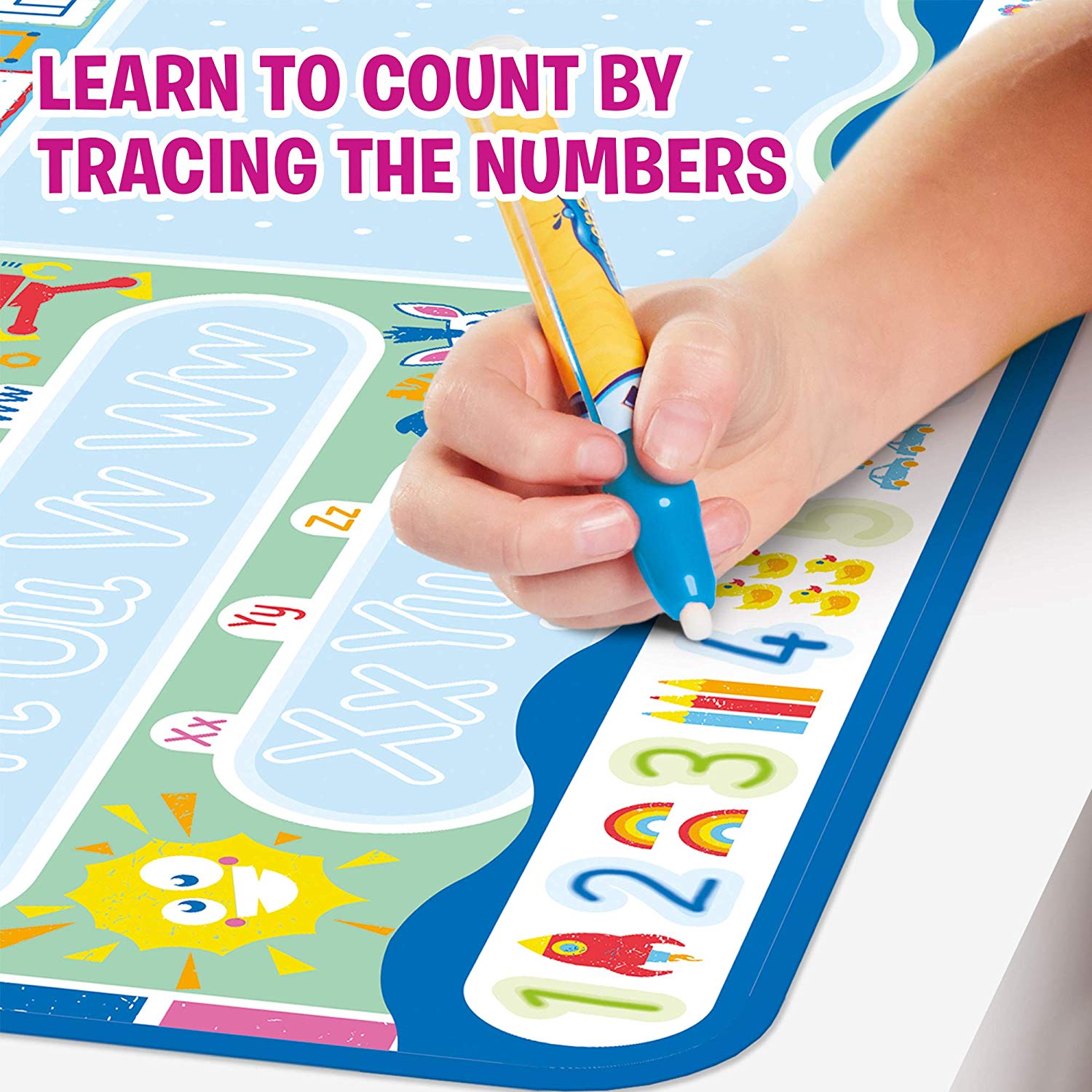 introducing the My ABC Aquadoodle. Fill the Aquadoodle pen with water, run the nib over the mat and see your drawings appear like magic! Once dry, drawings fade away and ready to start all over again. Includes 1 Aquadoodle pen for unlimited doodling. This water colouring play mat is the perfect educational toy for your little one to get familiar with numbers, letters, shapes and objects as they trace the guiding lines on the mat.