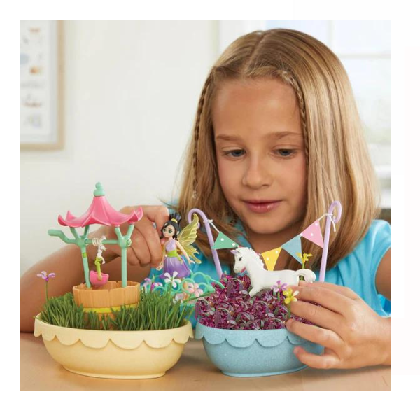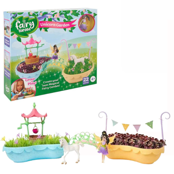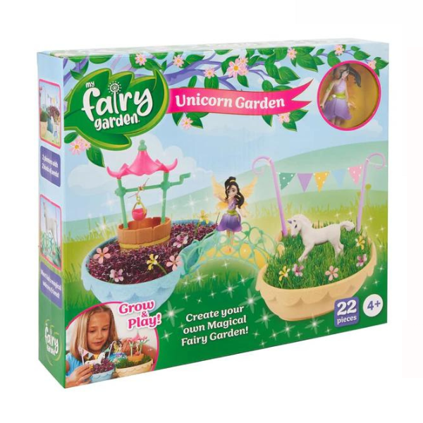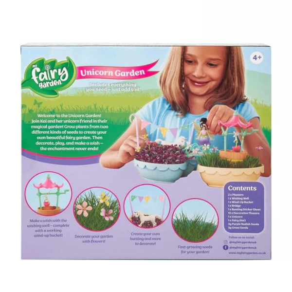Welcome to the My Fairy Garden Unicorn Garden! Join Kai and her unicorn friend in their magical garden! Grow plants from two different kinds of seeds provided to create your own beautiful fairy garden. Create your own bunting and more to decorate, then make a wish with the wishing well – complete with a working wind-up bucket! The enchantment never ends! This set Contents: 2 x planters, 1 wishing well, 1x wind-up bucket, 1x bridge, 1x bunting sticker sheet, 12x decorative flowers, 1x unicorn, 1x fairy (kai), 3g purple radish seeds, 3g grass seeds