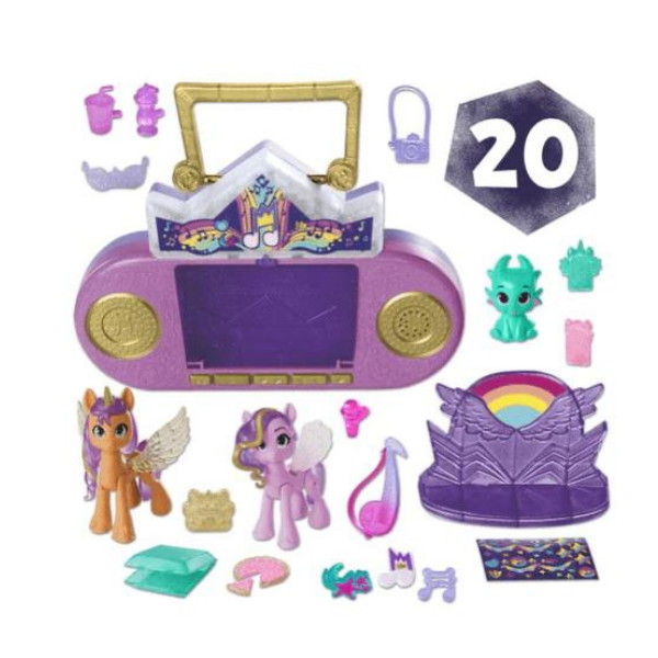 Includes 7.62cm Sunny Starscout and Princess Petals pony figures, and a Sparky Sparkeroni baby dragon figure. Look out for Cutie Mark Magic ponies and more to activate different lights and music! (Additional figures each sold separately. Subject to availability.) Comes with 16 accessories, sticker sheet and 2 cutie mark charms.