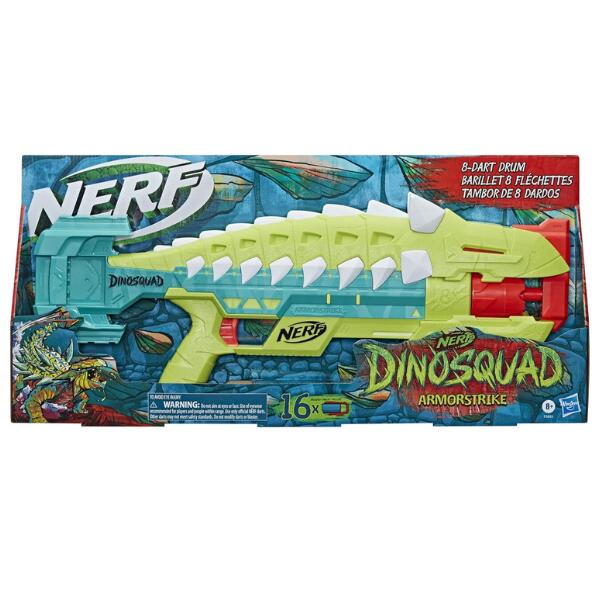 Team up with legendary dinosaurs as a member of the elite DinoSquad! Harness the extraordinary force of the greatest dinosaurs of all and blast into amazing adventures and outdoor play. Charge into action with the Nerf DinoSquad Armorstrike blaster! It features an awesome dinosaur design, capturing the look of an Anklyosaurus dinosaur. Launch 8 darts in a row from the 8-dart rotating drum to show your targets that you have plenty of dino-power. The blaster includes 16 Nerf Elite foam darts, giving you additional darts for reloads. DinoSquad Nerf blasters are great gifts for 8 year old boys and girls and up to enjoy active outdoor play, and they’re the perfect dinosaur toys for fans to launch into imaginative games with prehistoric pals. Eyewear recommended (not included). Styles may vary. Nerf and all related properties are trademarks of Hasbro.
