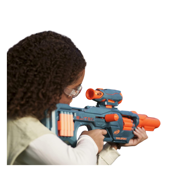 Customise the Nerf Elite 2.0 Eaglepoint RD-8 Blaster for any mission! This Nerf dart blaster includes an attachable scope and attachable barrel so you can create different blaster styles as you gear up for Nerf games. Go lean and mean with the core blaster, add the scope to line up your targets, add the barrel for distance targeting – you’re ready for whatever the battle brings with the Eaglepoint RD-8 blaster.