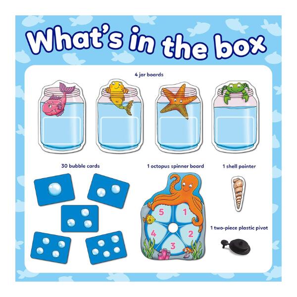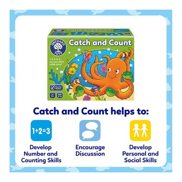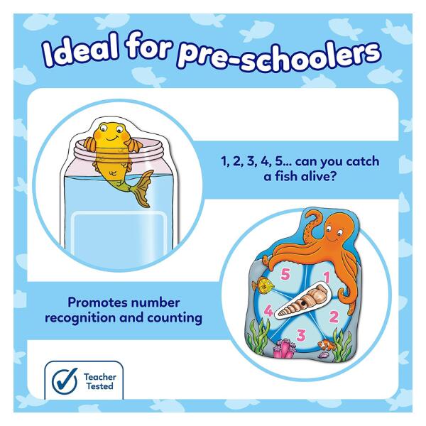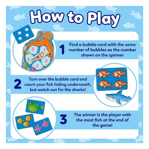 Orchard Toys Catch & Count. Spin the octopus spinner to see how many fish you can catch, but do take care…there’s a shark out there! Spin the spinner, count the number of bubbles and collect the matching cards on your fish board. But watch out! If you turn over a shark card, it will eat all of your fish and you’ll have to start again! The player with the most fish at the end of the game is the winner!