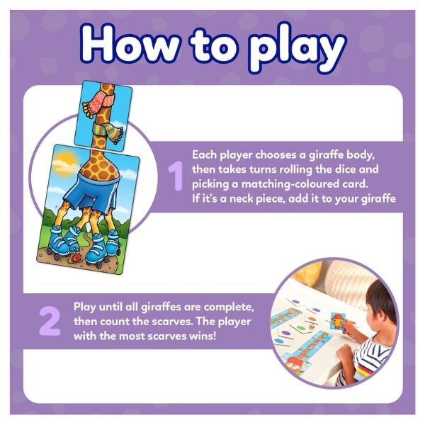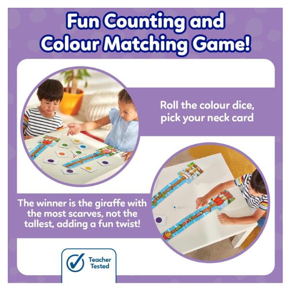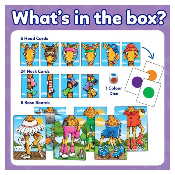 How many scarves can you collect for your giraffe? Roll the dice, pick a card and build your giraffe in this fun counting and colour matching game. The winner is the player with the most scarves on their giraffe!