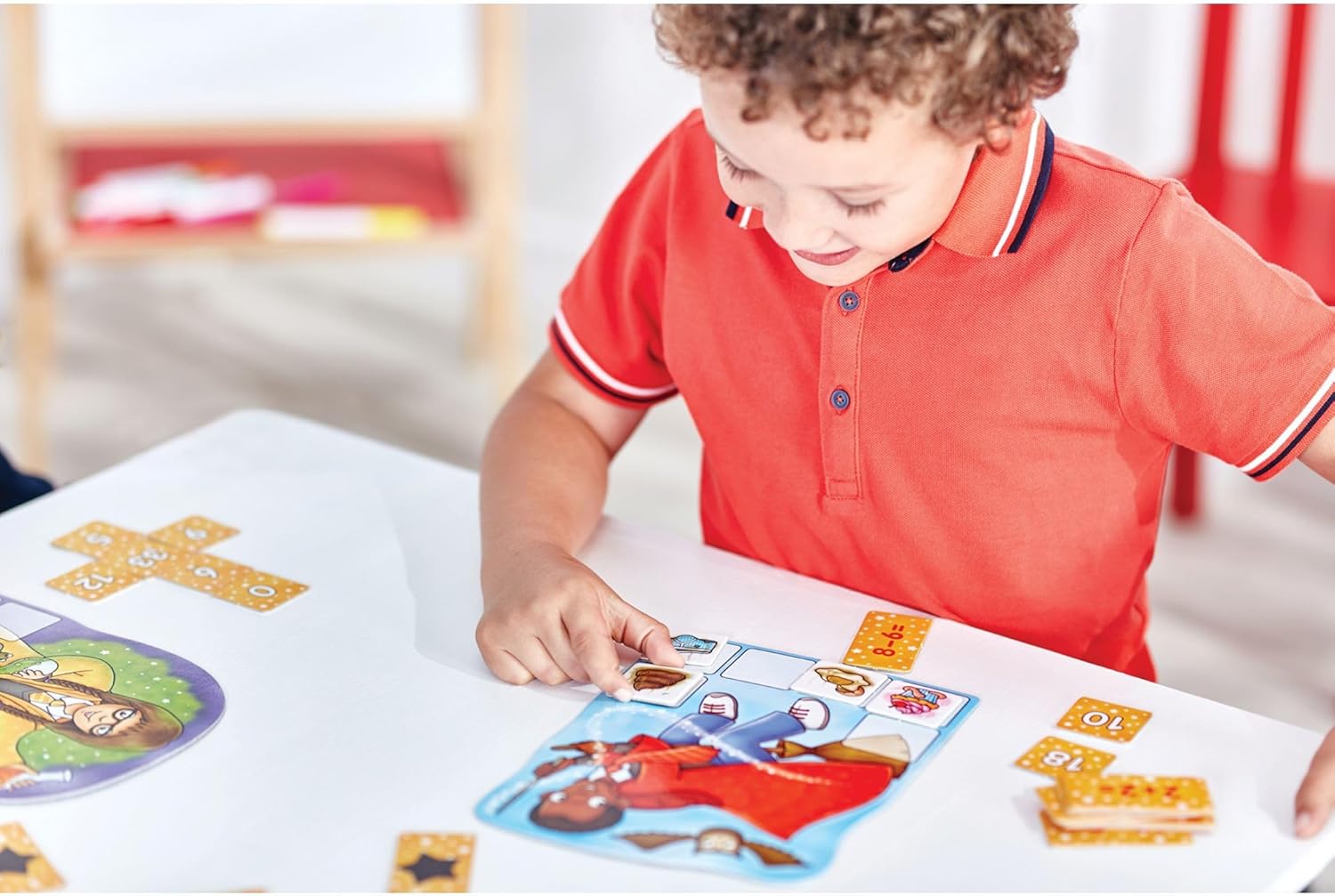 Orchard Toys Magic Maths. A magic way to learn Maths from Orchard Toys. Using addition, subtraction and also multiplication race to fill your wizard board with yucky ingredients. Each player gets 6 ingredient cards face down on the table. On the back of each card is a number. There are 30 magic sum cards also turned upside down. Pick one, work out the sum and see if matches one of the numbers on your ingredient cards. If you think it does check by rubbing the star on the magic sum card and abracadabra the answer appears and you get to keep the card. 4 wizard boards, 30 spell ingredient cards, 30 magic sum cards and also instructions.