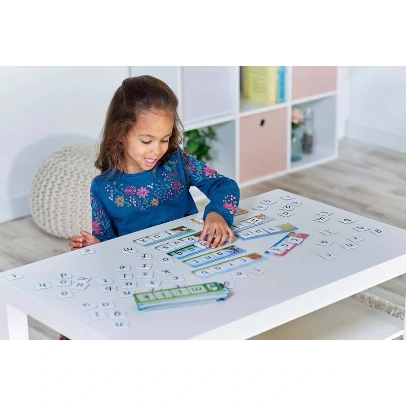 Beginners start with a simple matching game, matching the letter cards to the letters shown on the board. This builds a word to match the colourful illustrations, from ‘cat’ to ‘slug’. The Orchard Toys Match and Spell Game introduces letter shapes and also sounds, supporting children as they begin to read the words out loud.