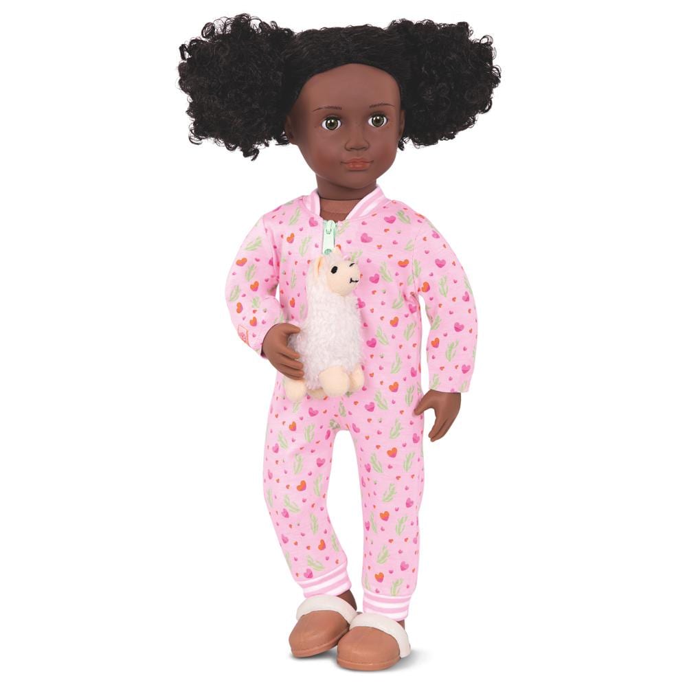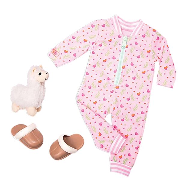 Our Generation Llama Lullabies. Get your bestie ready for bed by putting her in the adorable pink onesie with printed hearts. It has a turquoise zipper in the front so you can quickly change your doll before it’s time to say goodnight. These pyjamas also come with comfy slippers (in case she gets thirsty during the night) and your very own fluffy plush pet llama. Plan a slumber party with more of your favourite dolls or cuddle up together and drift off into sweet dreams! Doll sold separately.