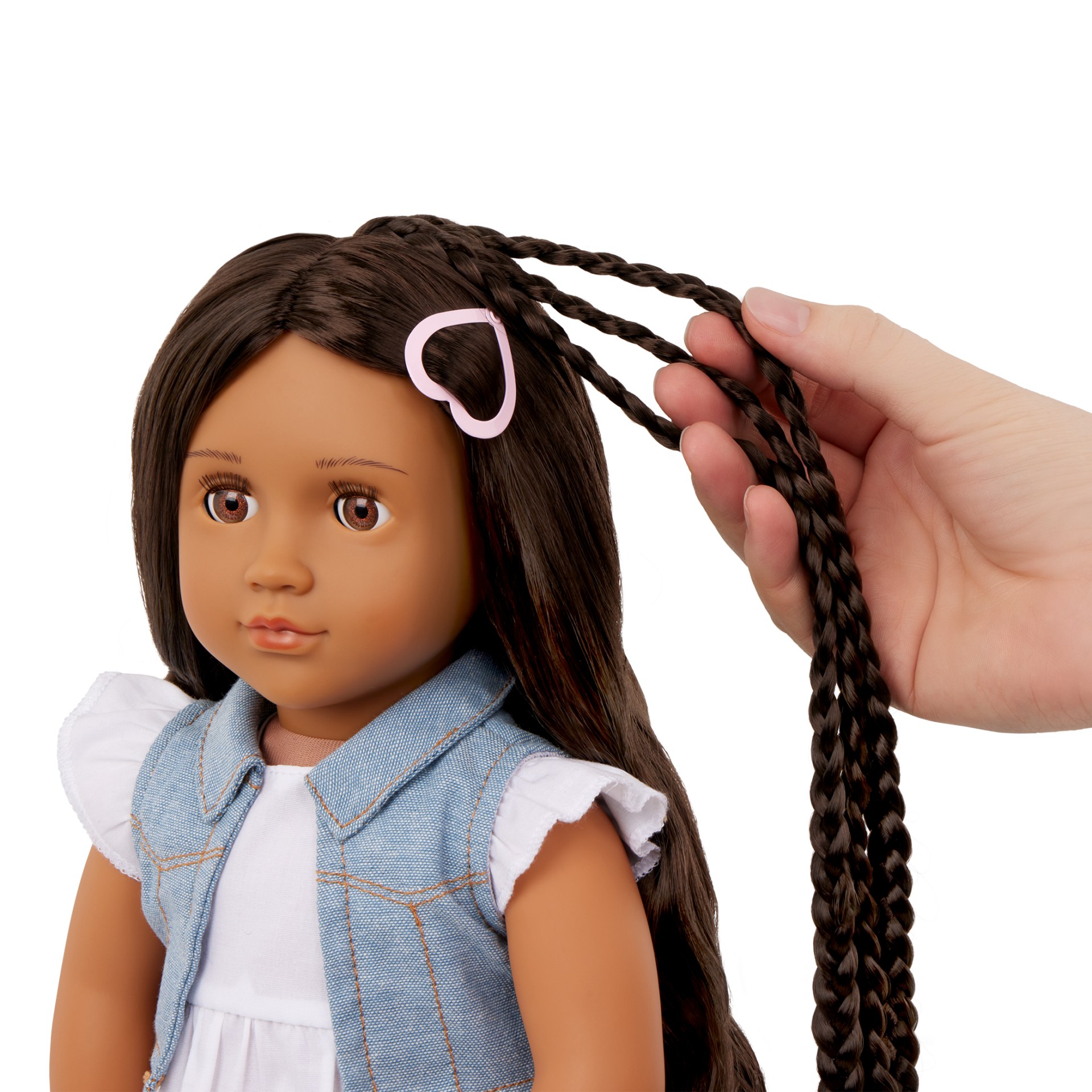 Introducing the Our Generation Perla From Hair to There Grow Doll with Extendable Braid. Let your imagination run wild with the Our Generation From Hair to There doll Perla! This lovely 18-inch doll has lifelike brown eyes that open and close with long (really long!) dark-brown hair that’s lots of fun to brush and style! Our Generation hair grow dolls have extendable braids that can be made longer or shorter with the push of a button.