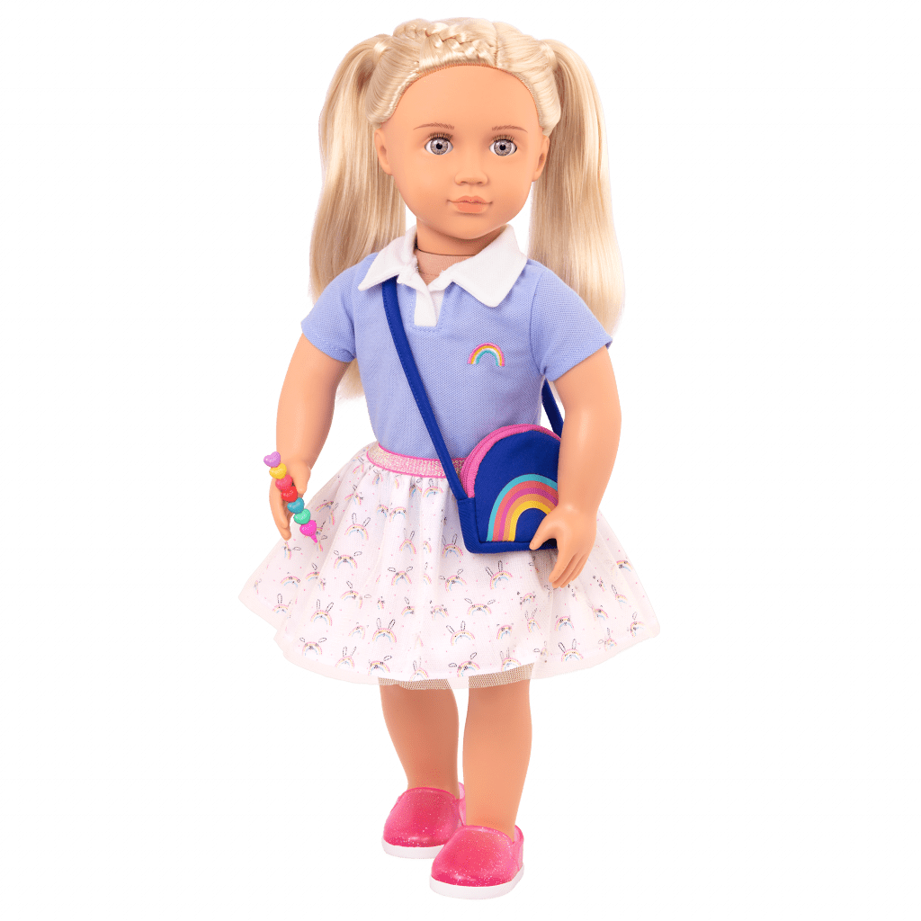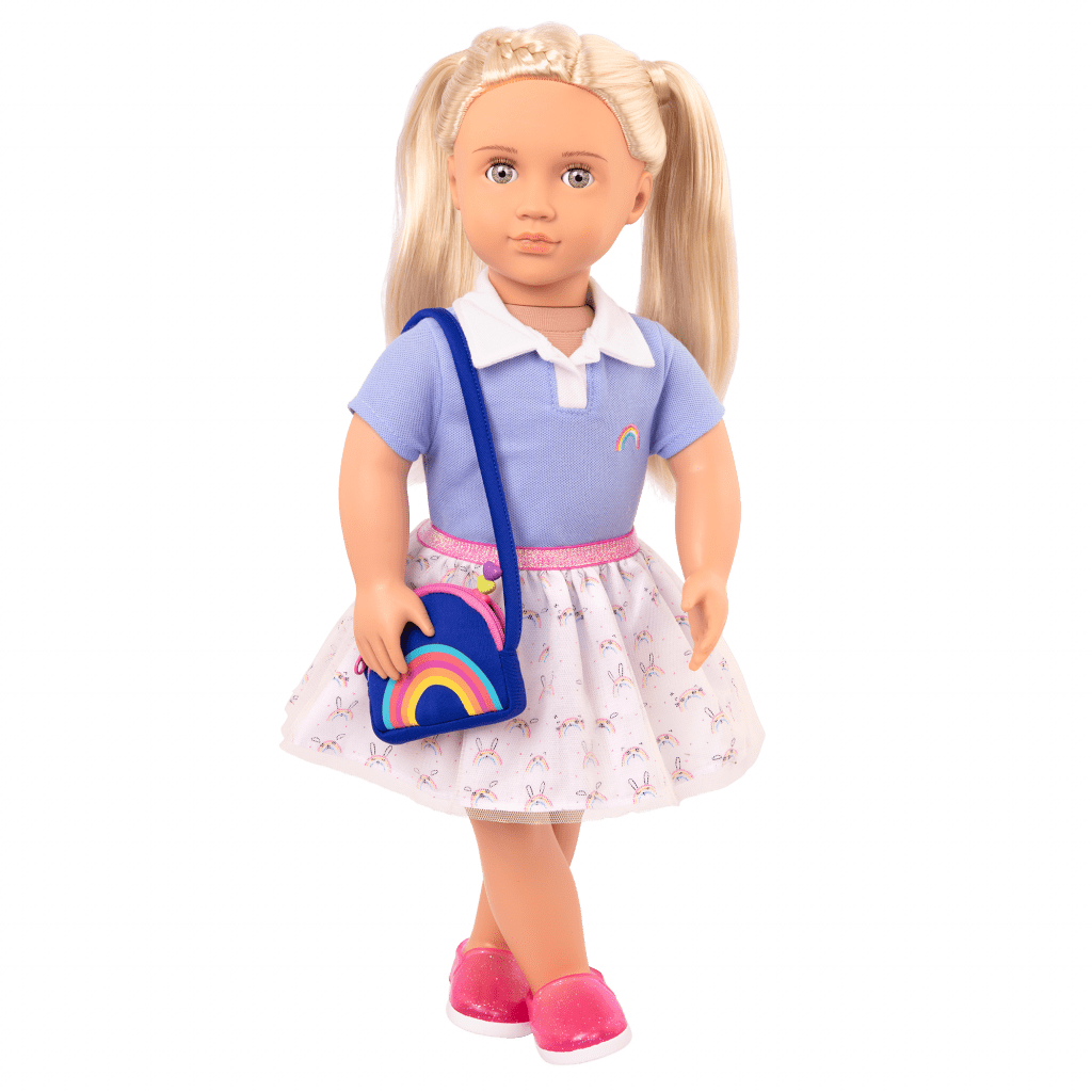 Our Generation Rainbow Academy Outfit. Brighten up your 18-inch doll’s school days with the Our Generation Rainbow Academy outfit! Dress your bestie in the light-blue polo top with the rainbow crest and complete the ensemble with the graphic skirt. It has mini rainbow bunny prints! Carry your doll’s favourite items on her way to class with the true-blue rainbow purse. It zips open to hold the colourful stacking pen. It comfortably hangs over your doll’s shoulder as she travels to class! This outfit features easy-open closures to quickly put on and remove, and it mixes and matches with many Our Generation clothing sets to give your learners bright styles for their days at Awesome Academy!