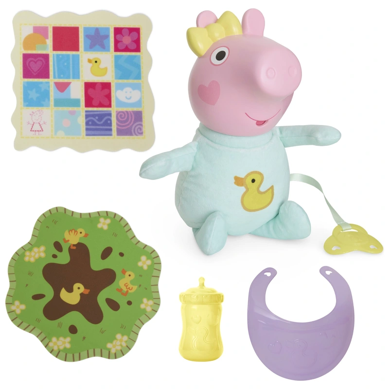 Activate over 20 different sound effects by giving her the pretend dummy or bottle, bouncing her up and down, or laying her down for pretend naptime. Cute accessories like a playmat, bib and baby blanket add to the nurturing play. Look for more Peppa Pig figures and playsets featuring Peppa’s baby sister Evie (each sold separately) for more Peppa Pig family fun!