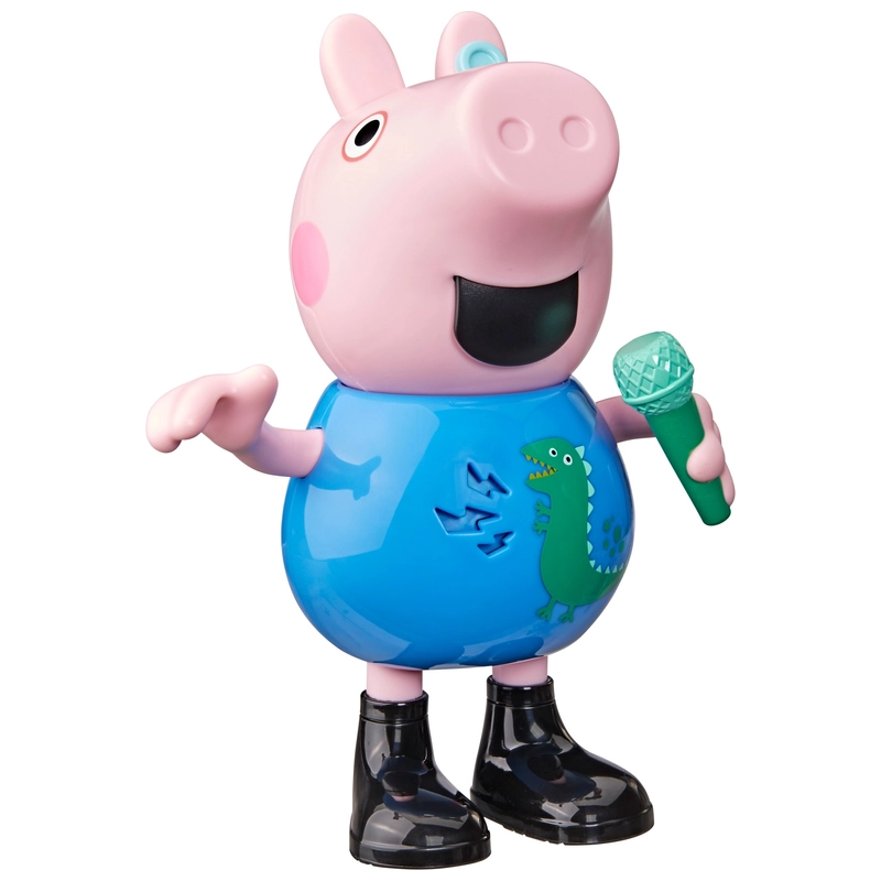 Peppa Pig Joke and Sing George features over 50 phrases, songs, and sound effects! This super cute George Pig talks, tells jokes, and sings 4 songs; switching modes is as easy as moving his microphone up or down.