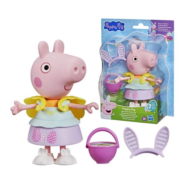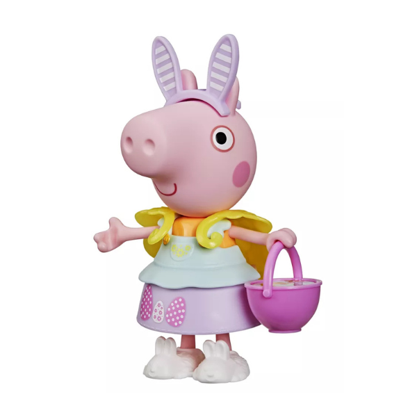 Peppa figure comes with bunny ears, bunny shoes, a yellow chick capelet, egg basket, springtime top, and egg-decorated skirt. Kids can mix and match to make sweet and silly combos