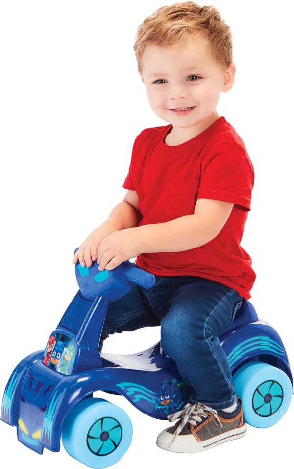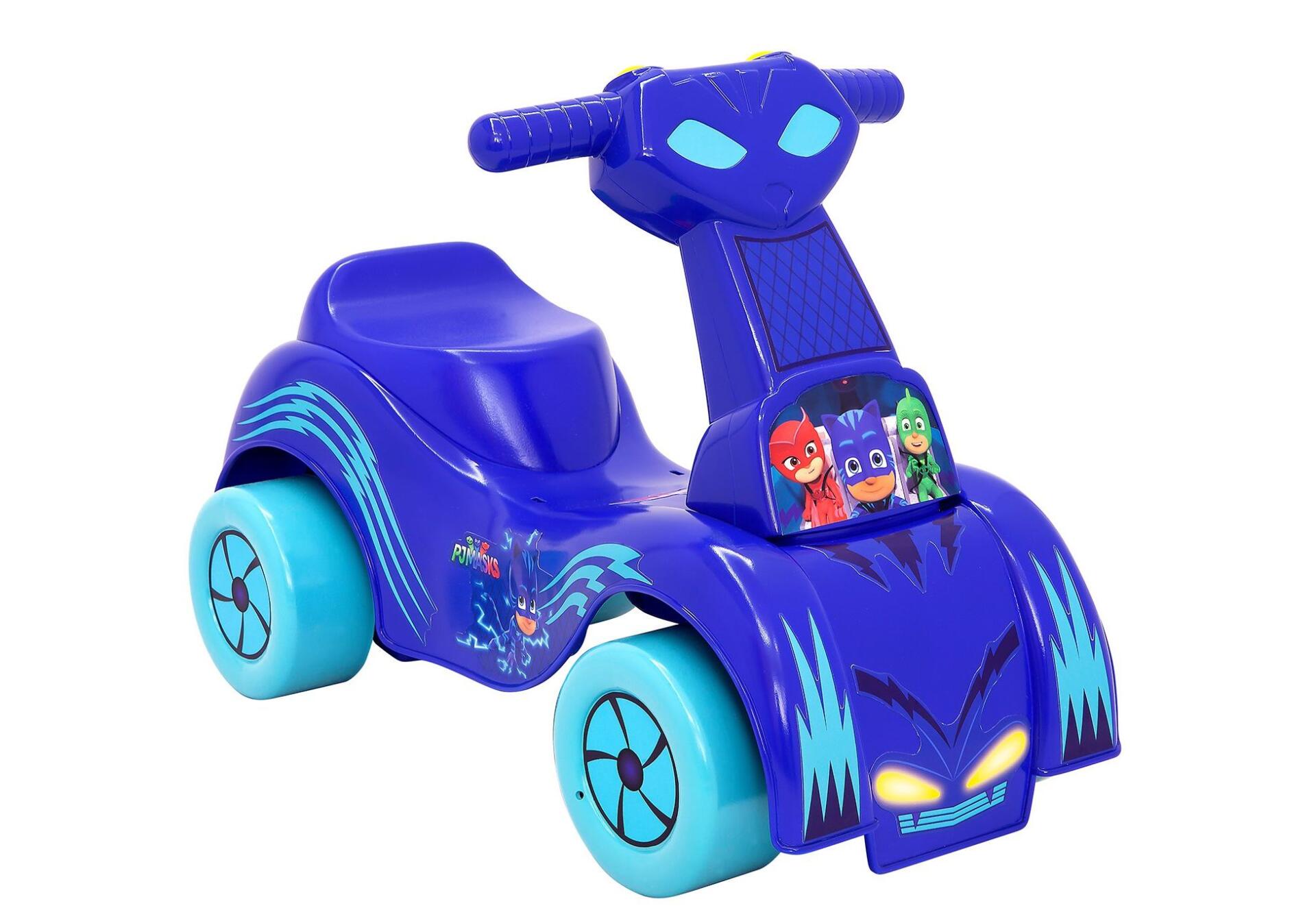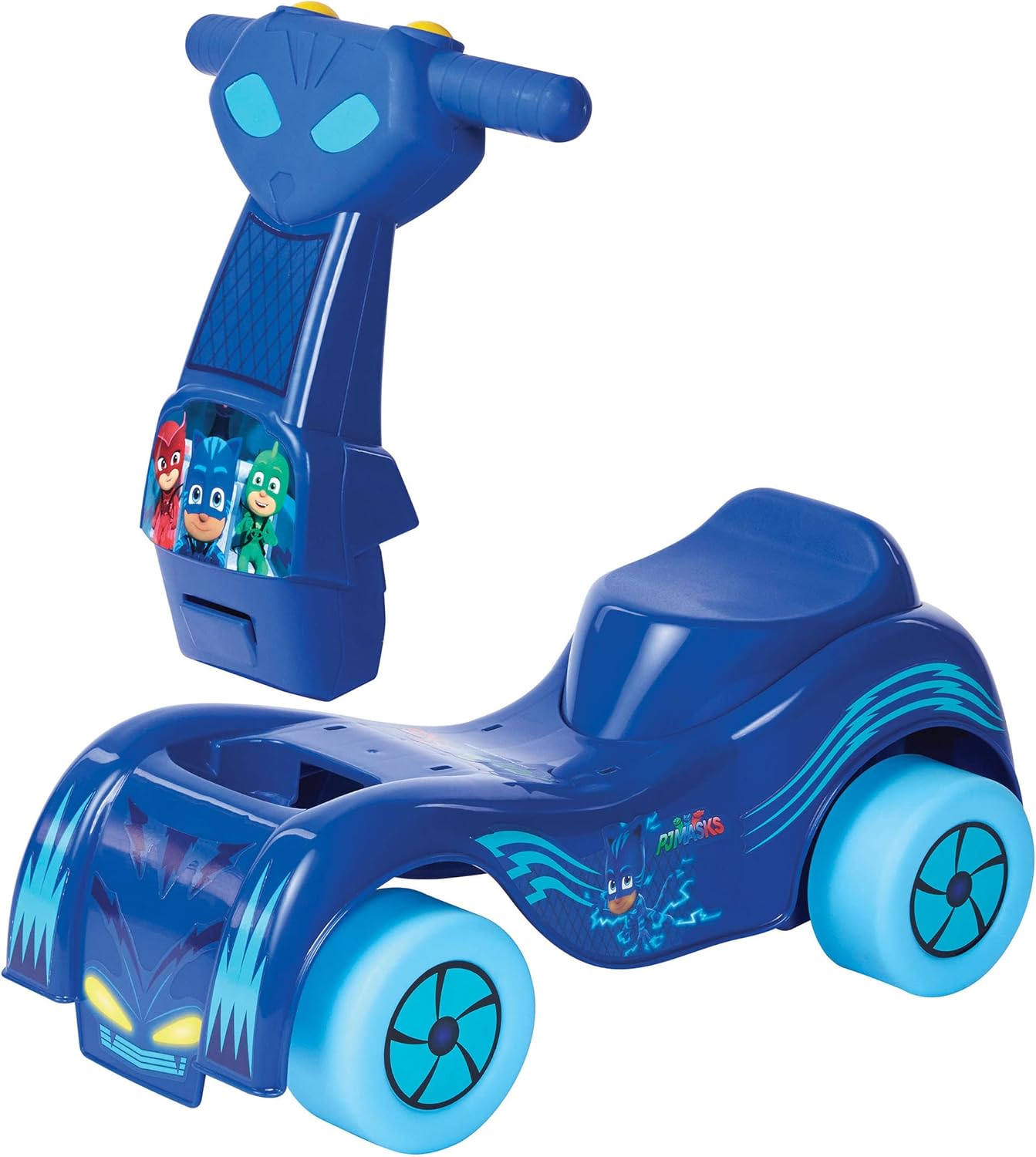 Introducing the PJ Masks Cat Car Push N Scoot. The PJ Masks Catboy push N scoot ride-on is the perfect scoot along ride-on for your child. It comes with great PJ Masks colorful graphics. It features design based on PJ Masks characters. This awesome ride-on is the perfect mode of transportation for your little one. It comes with an easy one-time lock customer assembled handle to help your child stay stable while they ride along. It also features a comfortable seat and wide wheels for stability. Suitable for children aged one to three years.