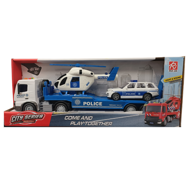 Introducing Police Transporter Vehicle With Lights & Sounds, The transporter truck often features emergency flashing lights and siren sounds for realistic play.