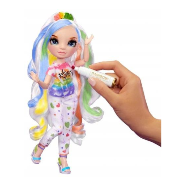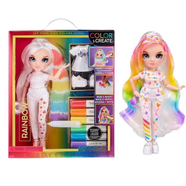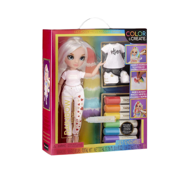 Rainbow High Color & Create Fashion Fashion Doll inspires kids to be unique. The colourful, quirky and inclusive fashion doll line encourages children to be creative in their stories, their art and their personalities. With the included washable rainbow markers you can color the hair, outfits, shoes and hairband. You can create your own designs such as hearts, rainbows, stripes and more. Simply rinse and repeat as many times as you like.