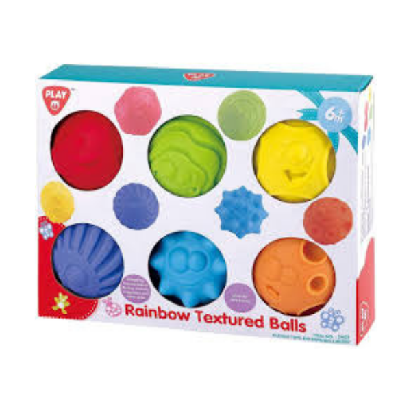 Rainbow Textured Balls. There are six balls in the pack, each different sporting colours, such as red, orange, blue, green, yellow, and also sky blue. These textured rainbow balls are made from PBA-free material and certified non-toxic. The balls are emoji-themed, expressing different emotions. The soft-to-touch balls have a standard size to fit in little hands easily. The bold contrasting colours will draw the baby’s attention, exploring and recognizing the balls’ different surface textures baby’s tactile and sensory development. The bright colours are also suitable for the baby’s visual stimulation. The colourful, embossed balls promote the development of dexterity, perception, and motility of a child. This lovely baby balls collection can also be a great bath time toy and a stress reliever for adults. Rainbow Textured Sensory Balls are generally recommended for babies above six months.