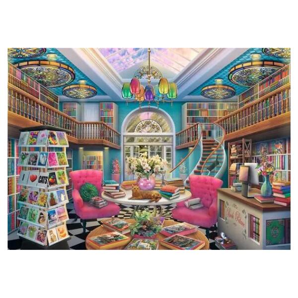 Introducing the Ravensburger The Book Palace 1000 Piece Jigsaw Puzzle . Bookshops come in all shapes and sizes. Some are small, dark and mysterious; places to find first editions and hidden treasures. Others are serious, focusing on academic works and textbooks. But this one contains all things bright and beautiful. Light shines through the pitched glass roof and stained glass ceiling lights onto the curved staircase and colourful ground floor.