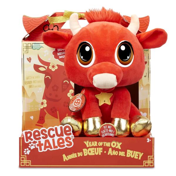 Celebrate with the irresistibly soft and snuggly Rescue Tales Year of the Ox. With a flip of the switch on its belly, kids can choose music or happy mode, and they will delight as the Ox reacts to movement with music and moos. The Rescue Tales Year of the Ox bobs its head and dances to the music. Kids can pick their very own name for their new friend and write it on the customizable collar.