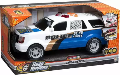 Introducing the Road Rippers Rush & Rescue Police K-9 Unit. Future police officers are sure to find the bad guys with their K9 Unit. Hear rescue noises and crime fighting music. Society and man’s best friend team up to fight crime in the Police K9 SUV. The SUV features motorized forward drive along with engine and rescue sounds, music and vocal phrases. Suitable for children aged 3 plus years.