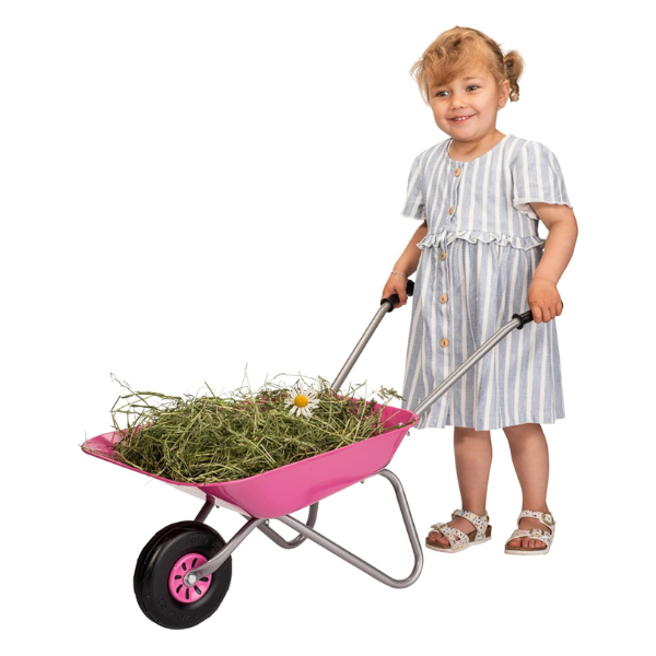 This large easily assembled Rolly Metal Wheelbarrow Pink has a durable metal frame and a robust metal bucket with a load capacity of approx. 25kg and features rubber handgrips. It helps children aged 2.5+ explore their creativity and encourages imaginative roleplay.