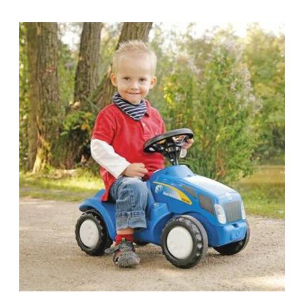 Rolly Mini Trac New Holland. Sit and ride toy, tray below the open bonnet, ergonomic vehicle contour with knee recess. Sturdy Ackermann steering, steering wheel with horn and also whisper wheels. Dimensions L x W x H 61 x 3 0x 41cm.