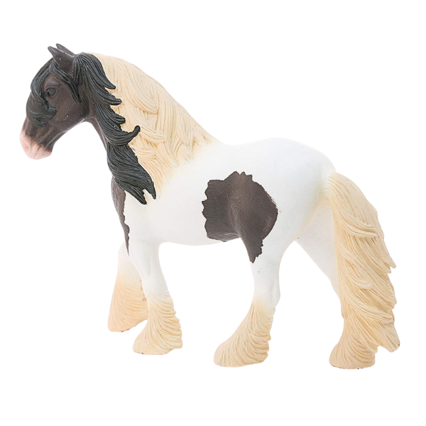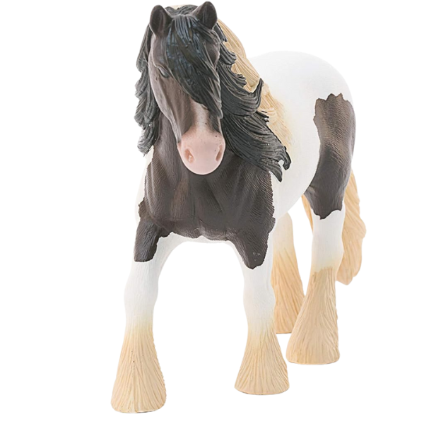 Schleich 13831 Cob Stallion. Coloured cobs are powerful horses with a full mane, strong feathering, a short back and large hooves. The typical piebald coat pattern was deliberately bred into the horses around the year 1900. They were first called “Magpies”. Cobs are very balanced and meek. Fun fact In Germany, they were not recognized as a separate breed until 2005.