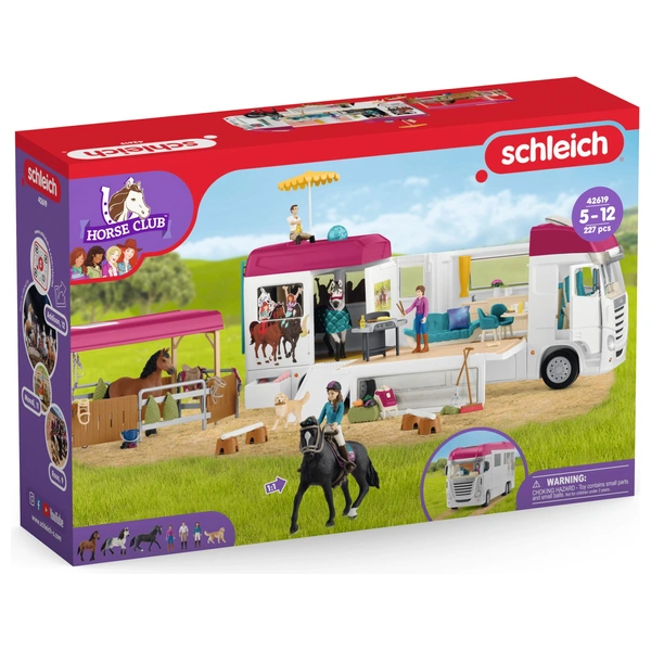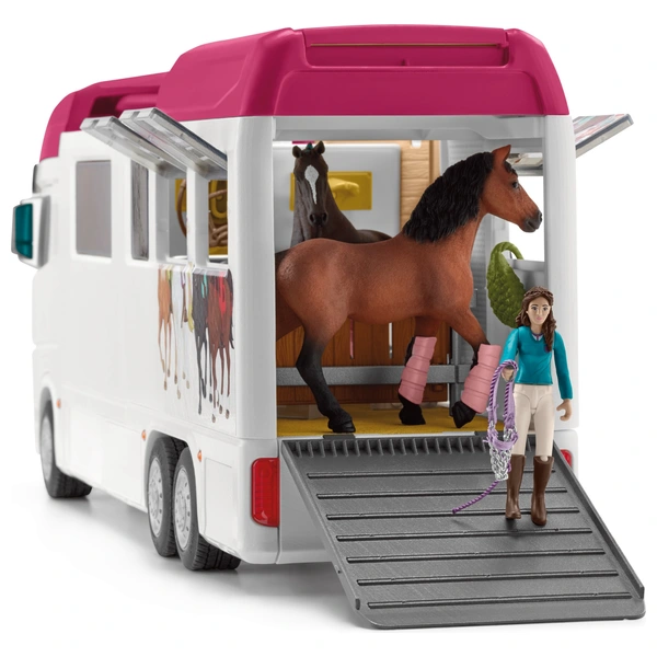 The Horse Club Transporter Set comes with everything you need to keep the three included horse figures comfortable! Set up a feeding station with the water container, hay bale, straw bale and two carrots. Ensure they’re ready for the show with the curry comb and card brush. When they’re ready for a rest, let them cosy up with the horse blanket or three saddle blankets – all included in this Schleich playset!