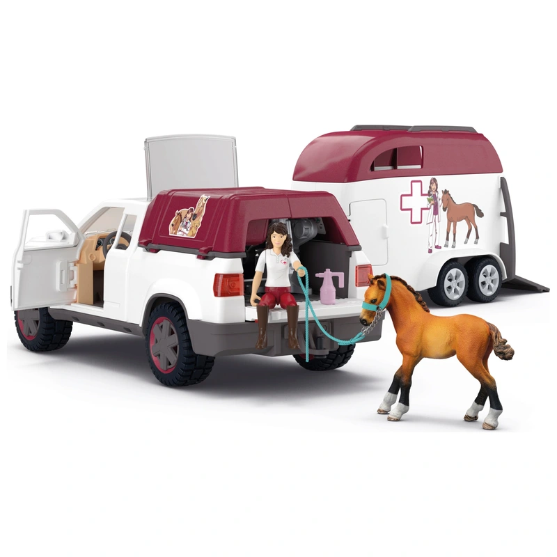• Introducing the Schleich 42704 Horse Club Mobile Vet with Trailer. The schleich Horse Club 42704 Mobile Vet with Trailer is the perfect set for equestrian enthusiasts and budding veterinarians! Mrs. Kramer, the dedicated vet, is equipped with a new pickup truck and horse trailer to transport her patients to safety. When disaster strikes and the Tennessee Walker foal is injured. Mrs. Kramer is already on her way, ready to provide care!