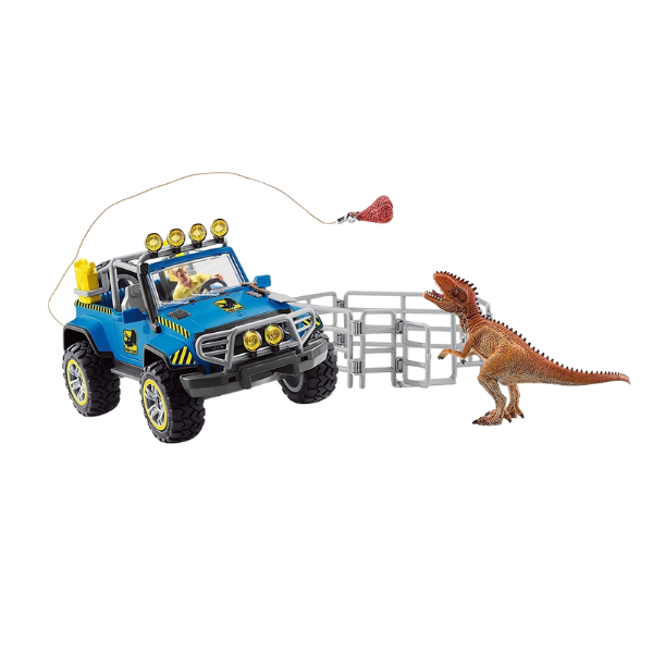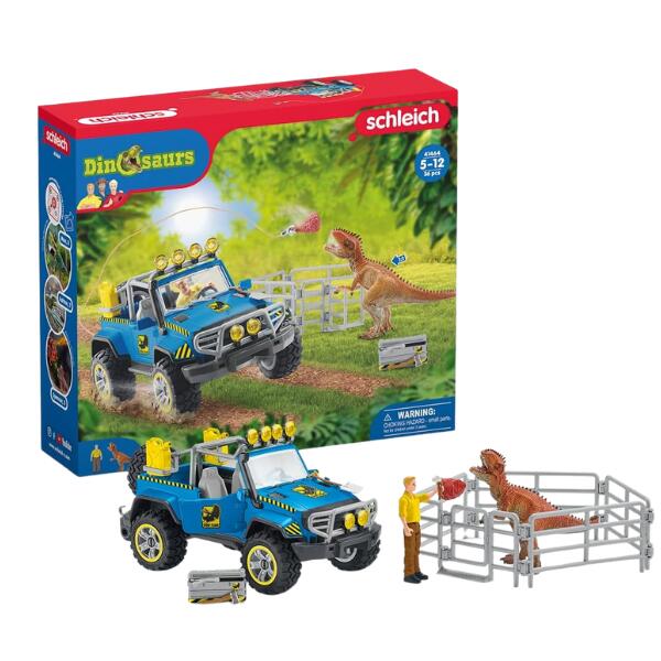 The Off-road vehicle with dino outpost from Schleich 41464 Dinosaurs is the perfect supplement to the Large dino research station (art. no. 41462). With the off-road vehicle, LUIS can get to the outpost quickly and catch the giganotosaurus with the help of a big meat bait.