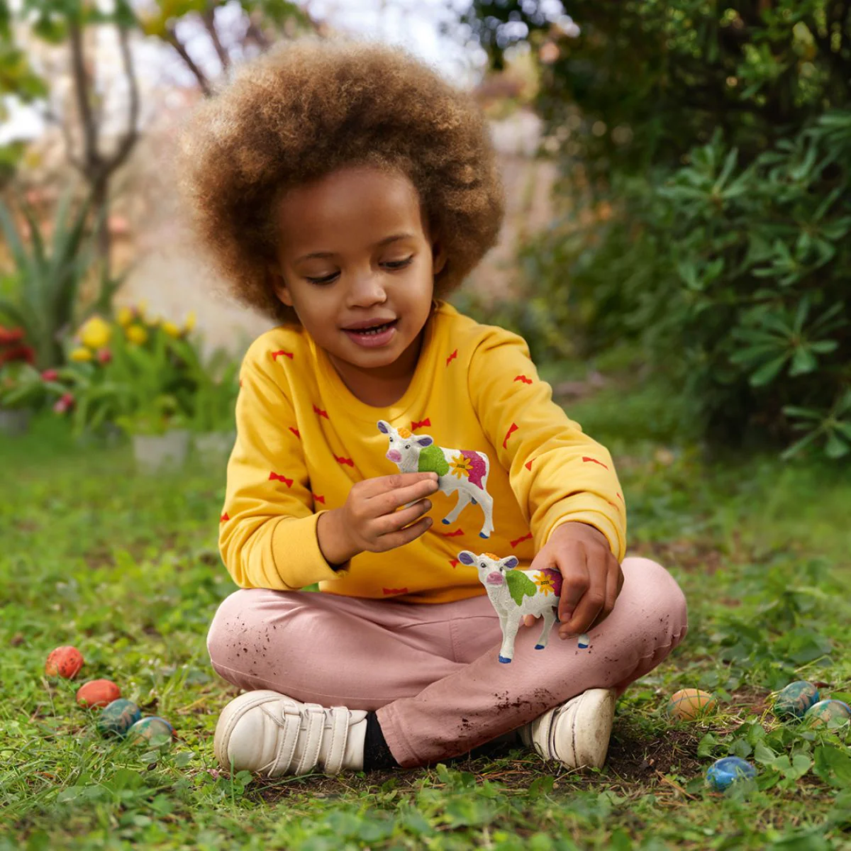 Schleich Farm 72207 Colourful Spring Calf. Spring has arrived and each colorful flower is more dazzling than the next. But what’s that? The spots on the little calf’s body have all kinds of colors! Did someone perhaps paint it in the Easter egg workshop? Or did it try to stow itself away in the Easter basket? The little calf really adds that extra dash of colour to the farm and children’s room.