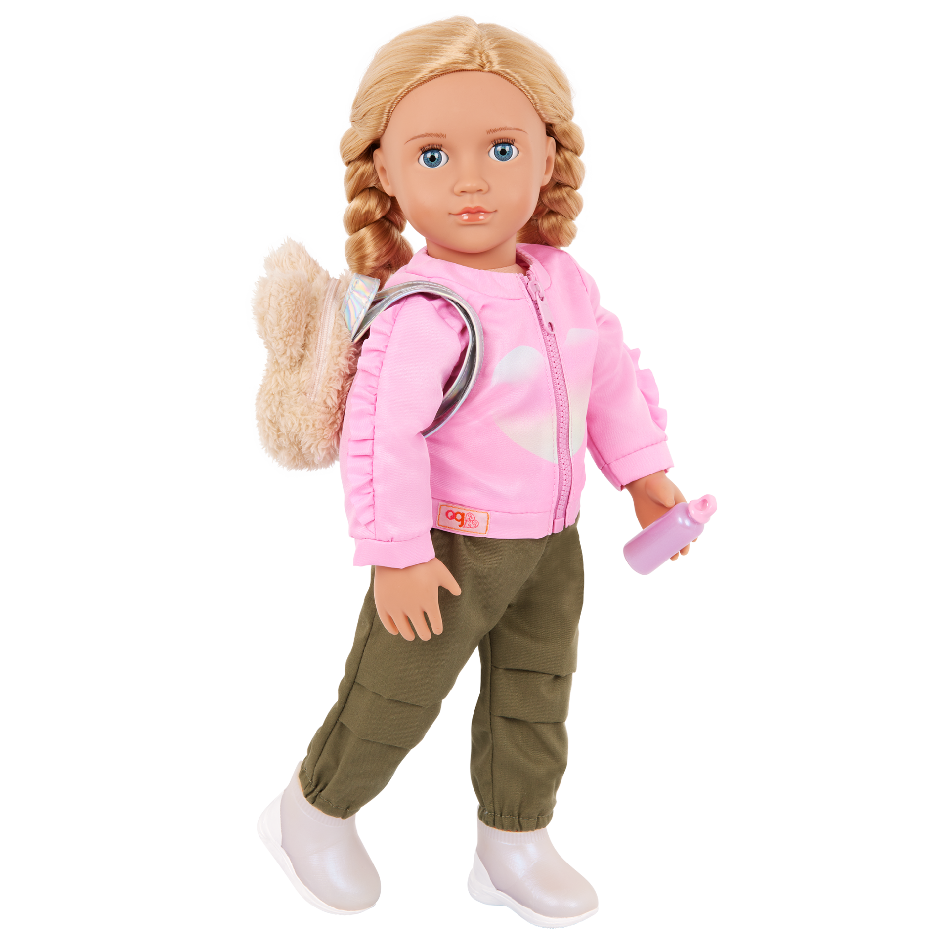 Introducing the School Shimmer Pink Jacket & Backpack Set. Explore cute styles and fashion fun with the Our Generation School Shimmer outfit! This 18-inch doll clothing set includes a pink zip-up jacket designed with pretty frills on the sleeves and a heart print on the front. It also comes with casual pants and running shoes for a complete outdoorsy look. Themed accessories like a soft, bear-themed backpack. And also school supplies add to the storytelling as kids pack the notebook, pencil, ruler, and water bottle for school days! When it’s time for dress-up, this 18-inch doll outfit has easy-open closures to quickly put on and remove. So kids can mix, match, and create more stylish looks as they explore imagination and self-expression. Our Generation 18-inch doll clothes make a great gift for kids ages 3 years old and up (small parts), encouraging them to create their own unique stories. Compatible with most 18-inch dolls, doll clothes, and accessories. Our Generation dolls sold separately.